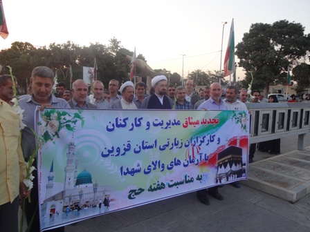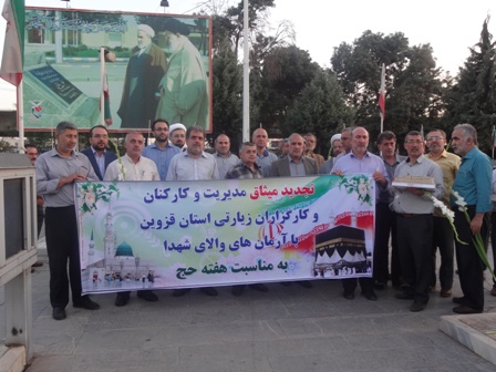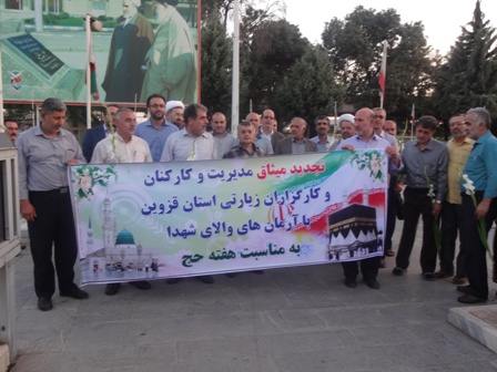 به گزارش روابط عمومی حج و زیارت استان قزوین، به مناسبت هفته حج، مدیریت و کارکنان حج و زیارت ، مدیران و عوامل حج96 و جمعی از کارگزاران زیارتیاستان قزوین در روز پنج شنبه مورخ 96/5/5 ساعت 20  با آرمانهای بلند شهدای والامقام 8 سال دفاع مقدس و شهدای حج جمعه خونین سال 66 با نثار گل و ذکر فاتحه تجدید میثاق نمودند.